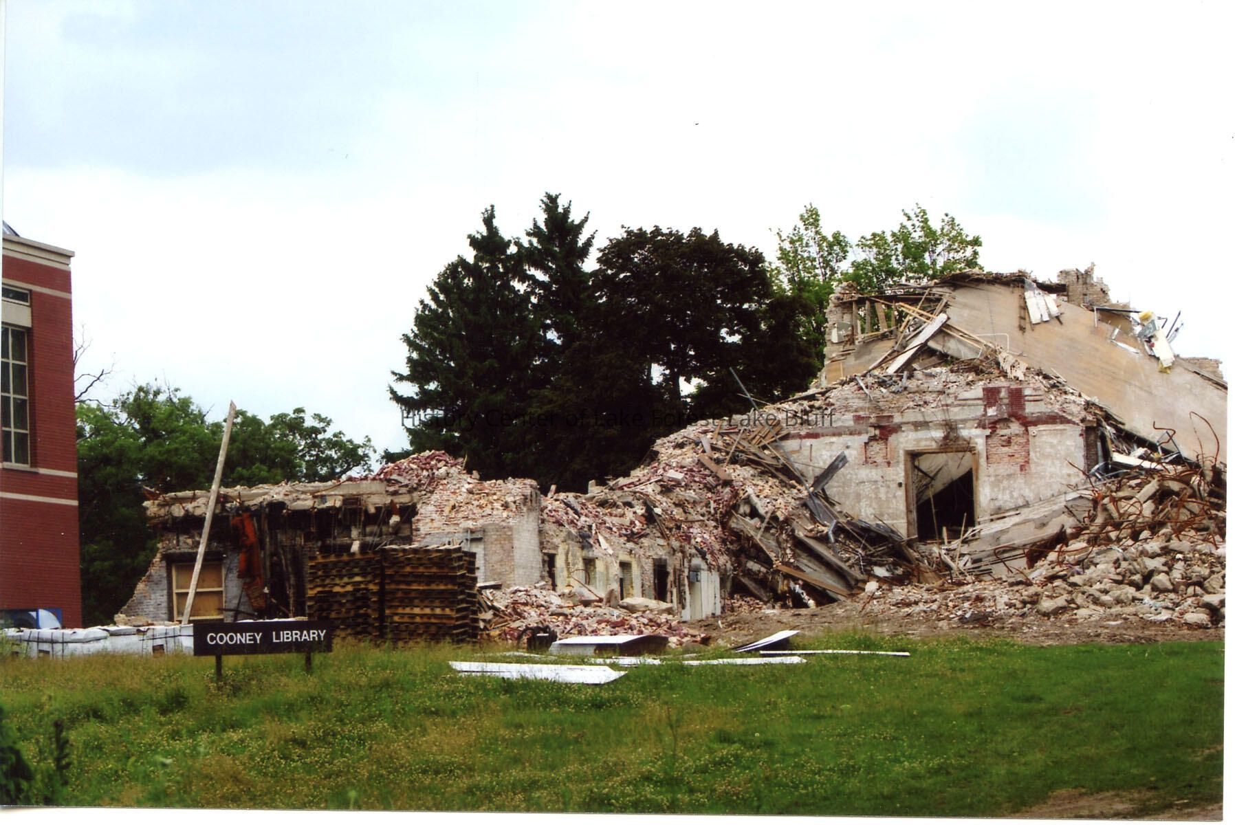Barat College, during 2013-2014 demolition process of Old Main. Photo shows west side of Old Main. Former Cooney Library building and sign visible at left. Taken July 6, 2014.