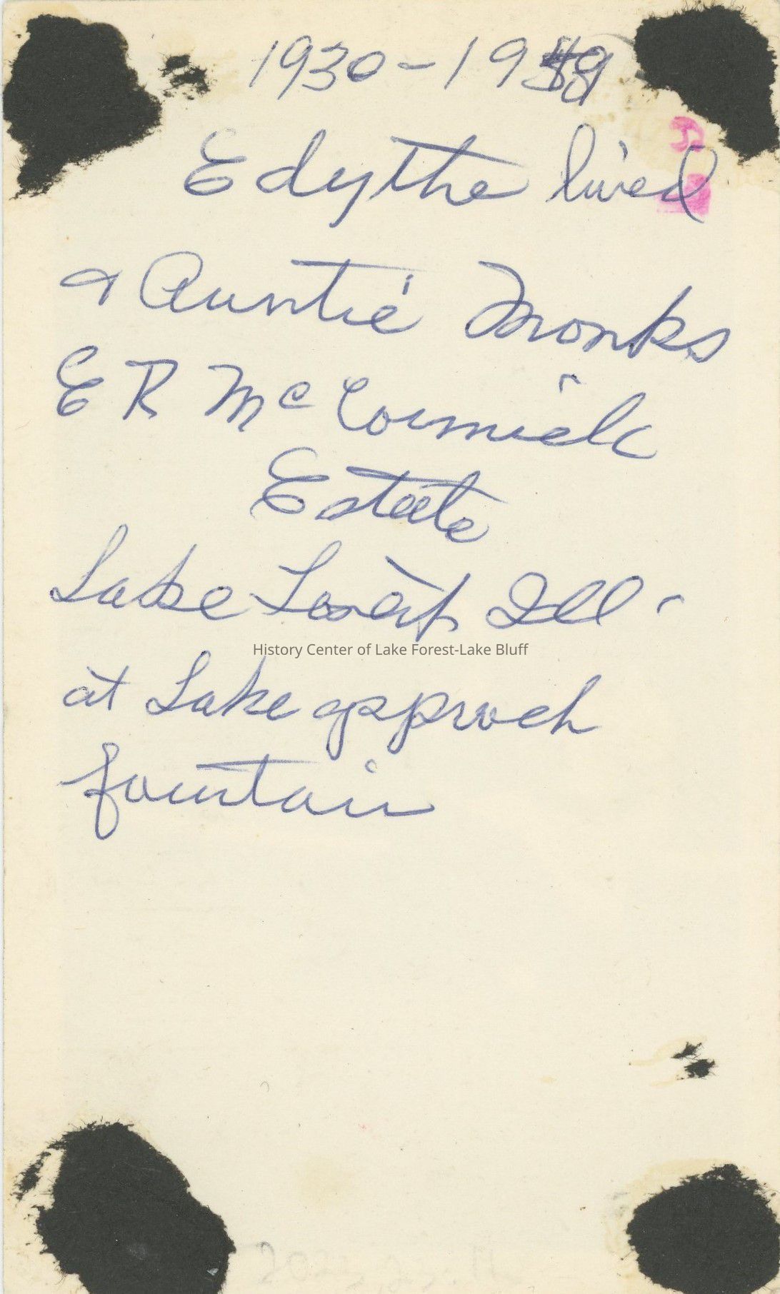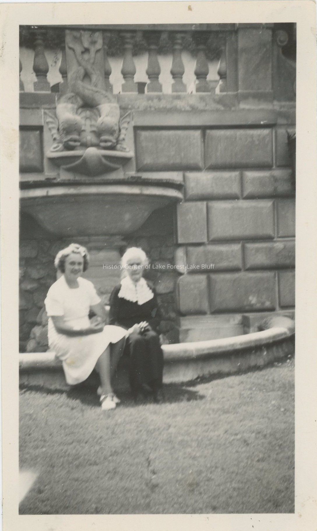 Edythe Dunford and Auntie Monks at Villa Turicum, the Harold F. and Edith Rockefeller McCormick estate. Edythe and her husband John were estate caretakers. Seated at lake approach fountain. 1930s.Photograph Details