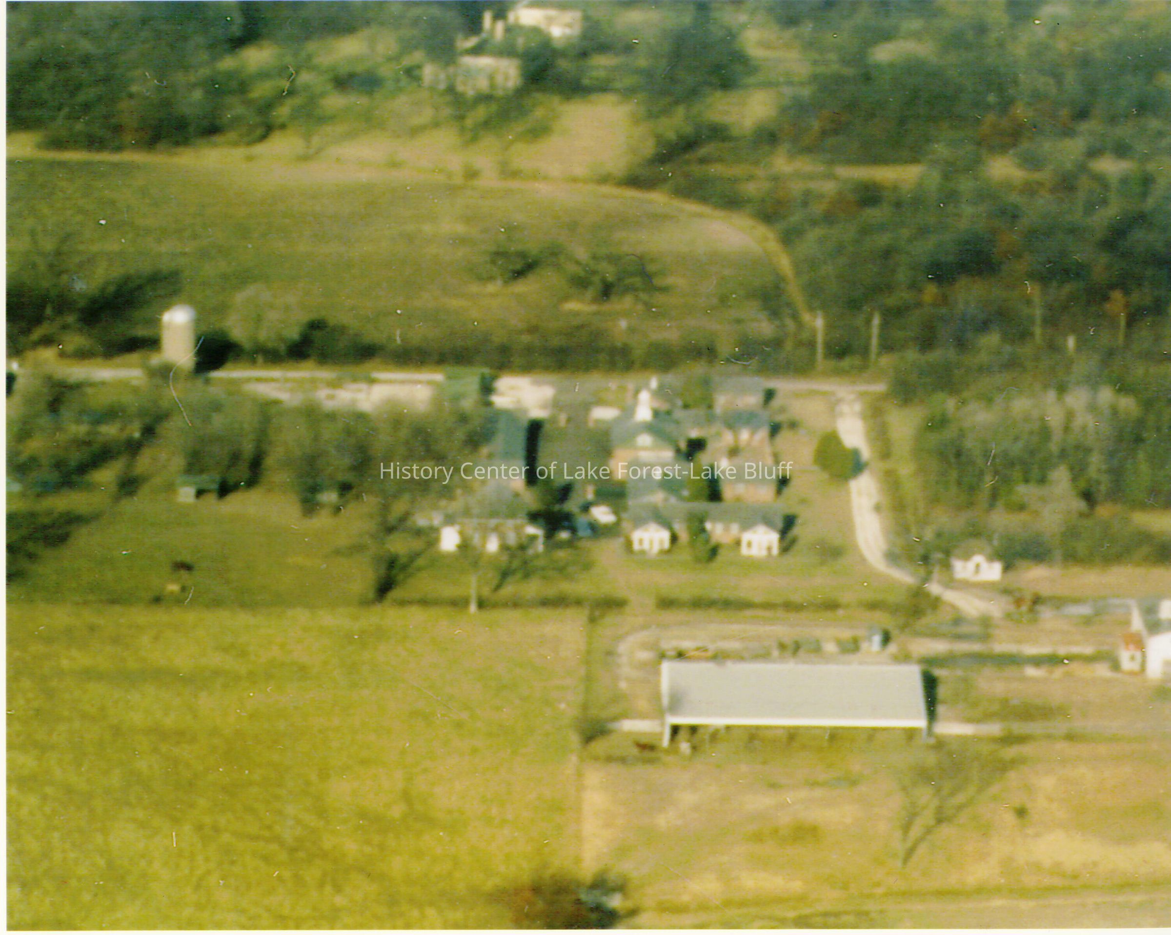 Copy of aerial image of farm complex. Looking north. Silo is on left. In right foreground there is a large barn structure.