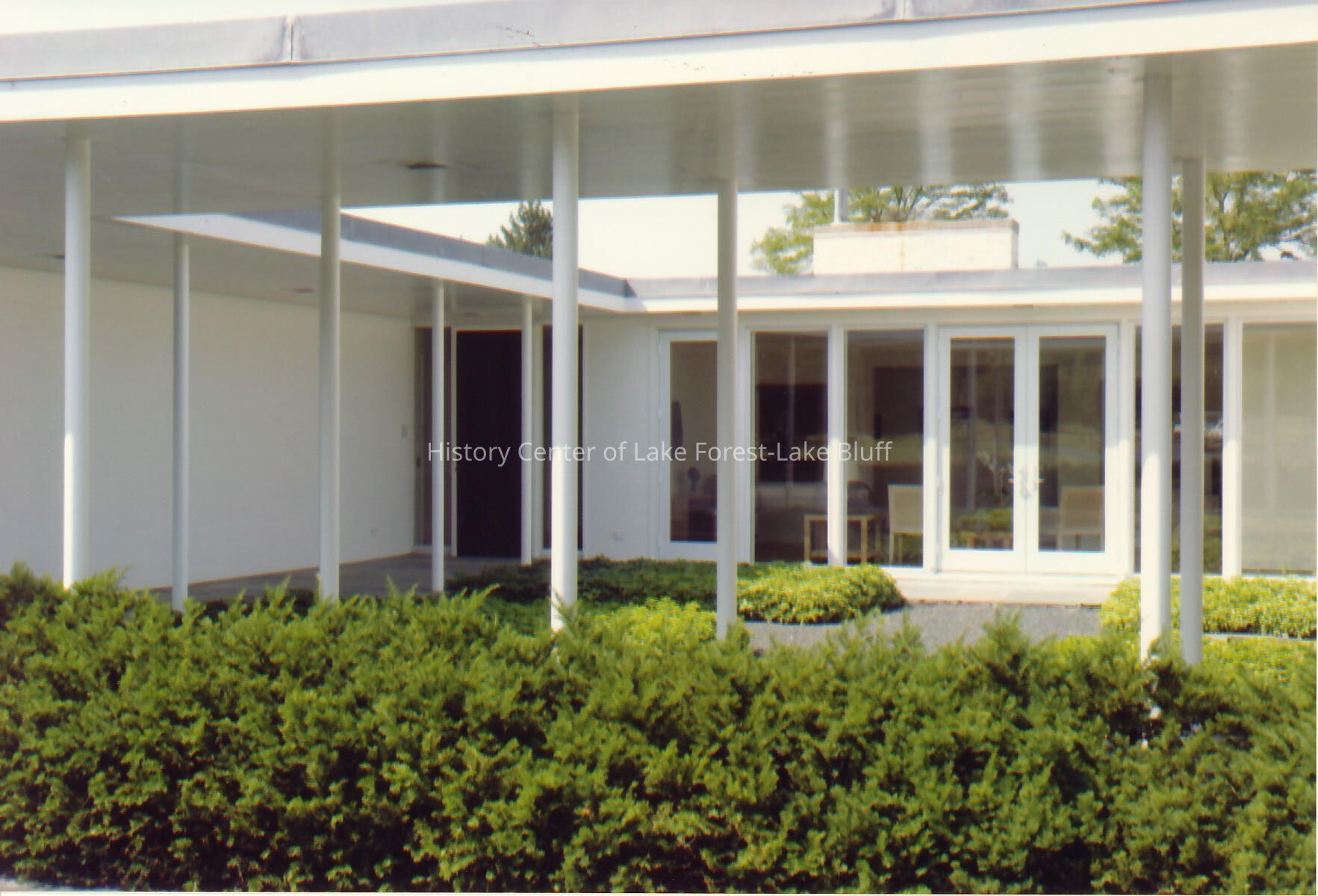 Close up exterior view of Walter Frazier home built for Elliot and Ann Donnelley in 1955. Located at 1050 Melody Lane in Lake Forest, Illinois.