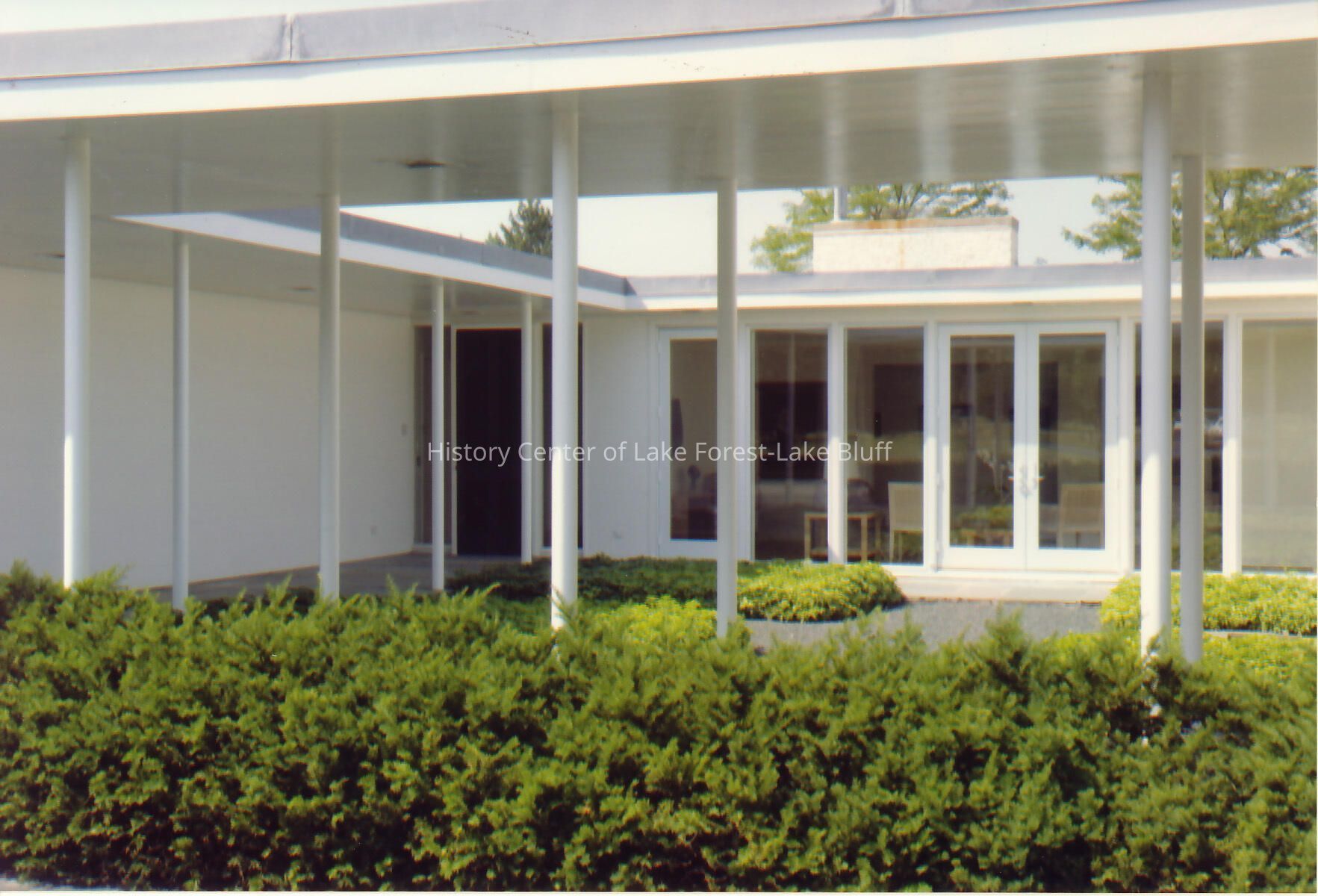 Close up exterior view of Walter Frazier home built for Elliot and Ann Donnelley in 1955. Located at 1050 Melody Lane in Lake Forest, Illinois.