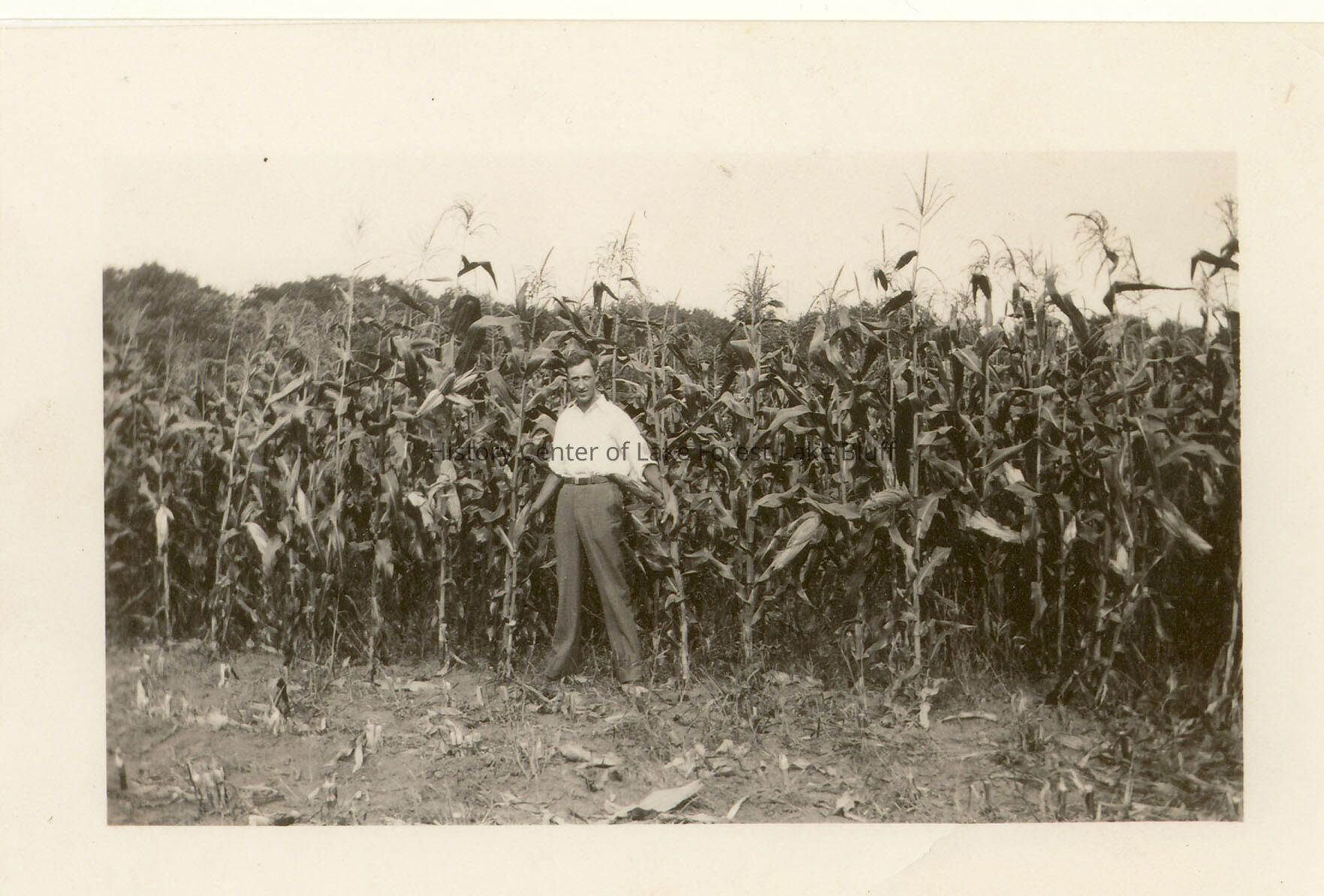 photo of a man standing in front of corn stalks, may be Herman Schalla.