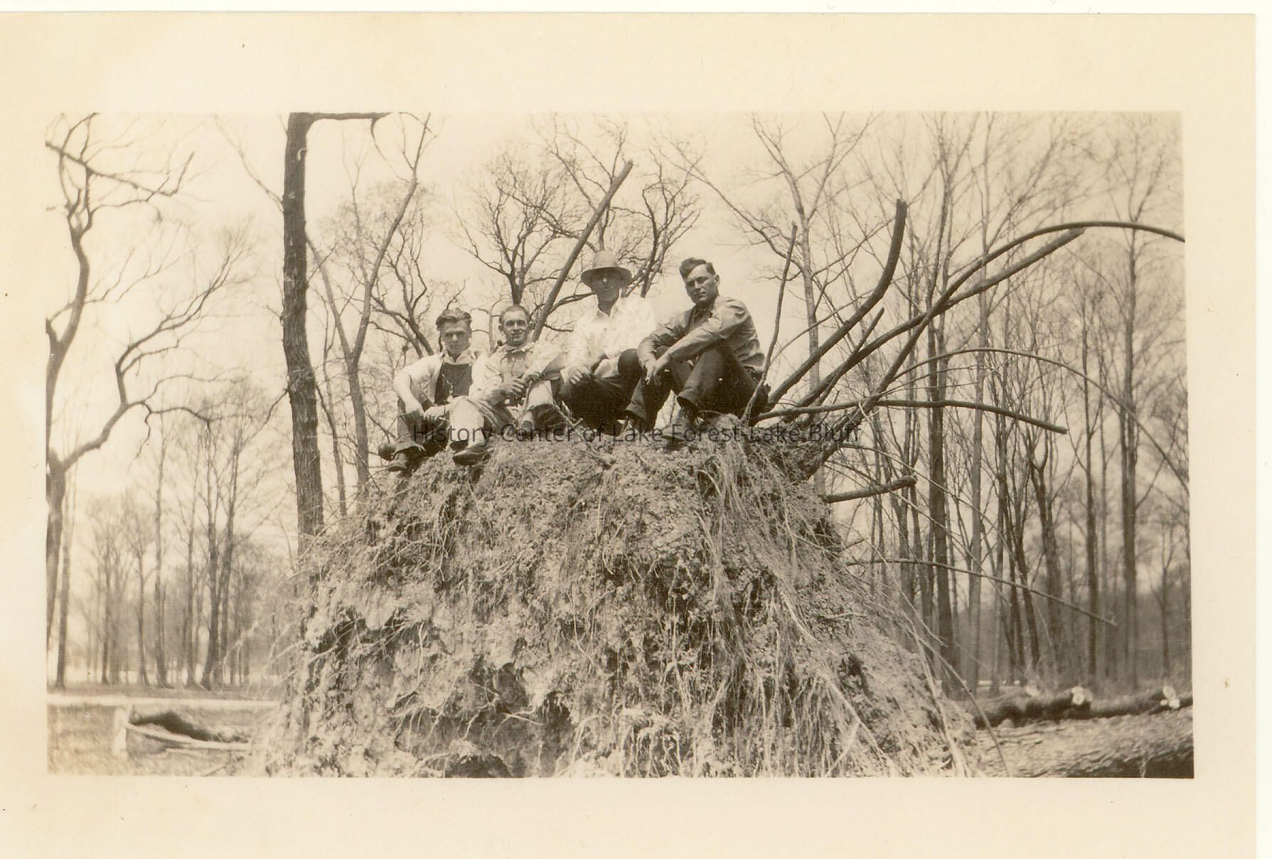 Four (4) men sitting on top of a dirt, wood pile, possibly a large root ball of a fallen tree