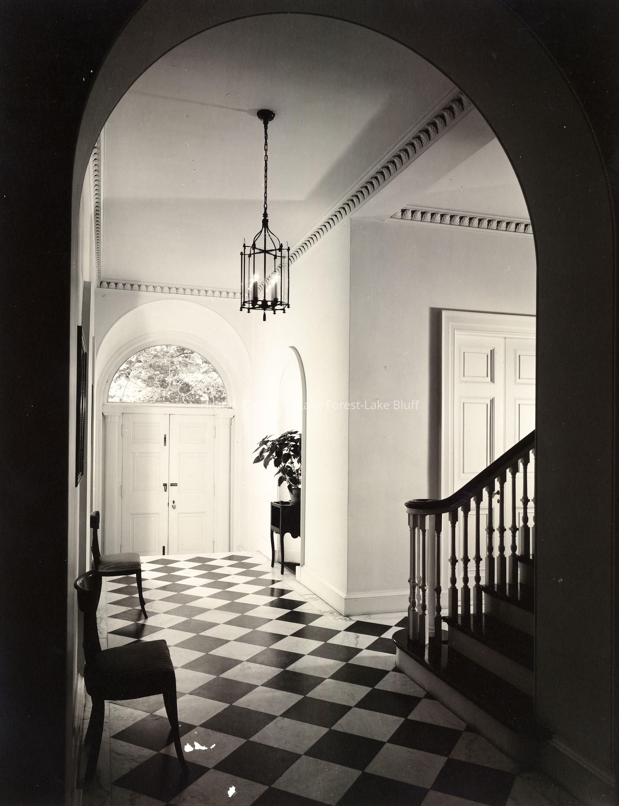 Entrance hallway with black and white tiled floor; fanlight window over double-doored entrance; arched niche for hall table; ceiling molding