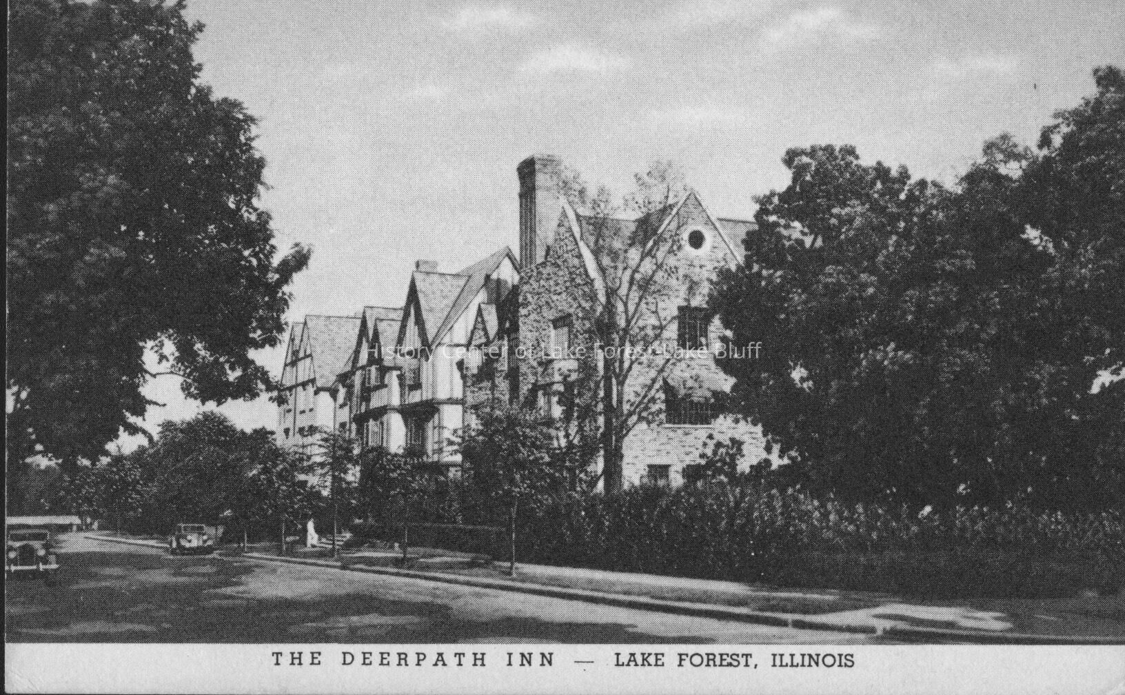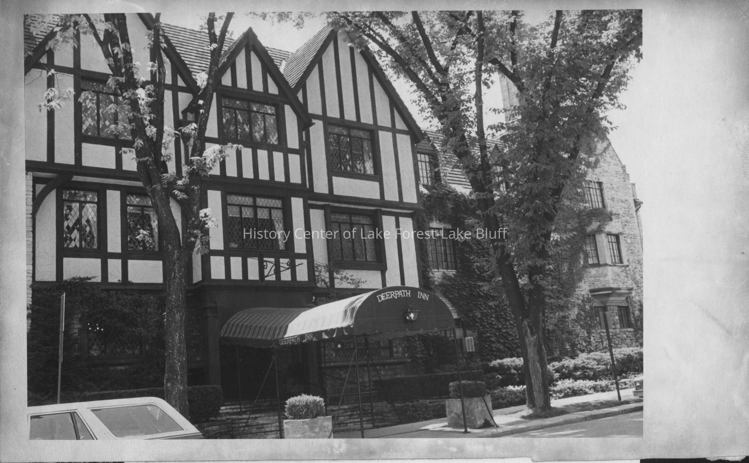 Black and white image of the Deer Path Inn, main entrance showing awning