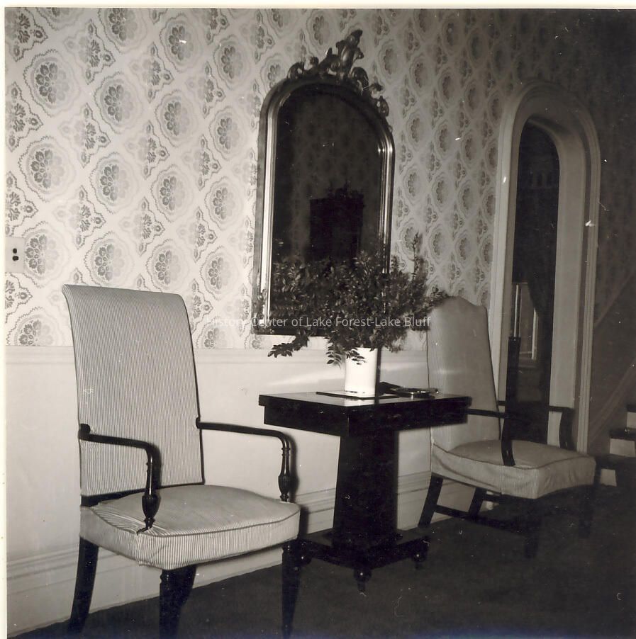 Interior image of front entry. 2 armchairs, upholstered in thin-striped fabric. gilded mirror with ornate scrolls at top. end table on casters with white vase. very partial view of staircase.
