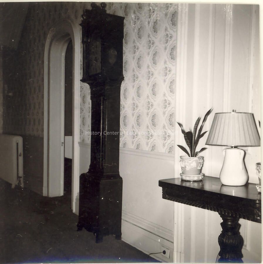 interior image of front entry. wallpapered walls, grandfather clock, side tablewith folk-style lamp and 2 Wedgewood planters on it.