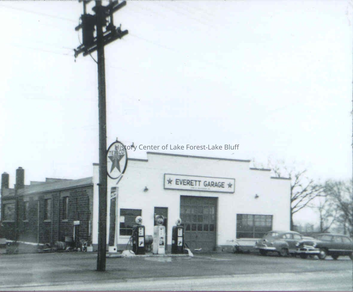 Everett Garage owned by the Liefer Brothers. 1045 South Waukegan Road. After a fire the front was rebuilt and painted white and a new sign was installed (as seen here). At center one bay garage.