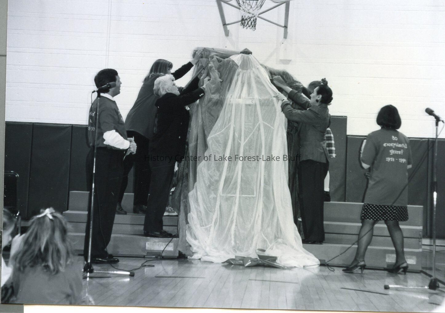 The unveiling of the bell at Everett School, Charles Accardi, Principal is behind the microphone, Cheryl Tucker and Shirley Paddock on the left and Pauline Mohr on the right lift the veil. The bell was returned to Everett School through the efforts of Shirley Paddock. It had been found in Arizona, intact, but was in need of restoration. The bell called children to school until September 11, 1914. It had hung in the second Everett School (the former Everett Fire Station, now razed) on Everett Road. The school closed in June, 1957 and the bell was no longer used. It was kept by former Everett School student and long time custodian and bus driver, Gene Seyl. When he moved to Arizona, the bell was brought with, it was returned by his daughter, Barbara Seyl LaDuke in 1993. The bell was officially unveiled and presented to Everett School in April, 1995, when Everett celebrated its 80th birthday.Lexicon