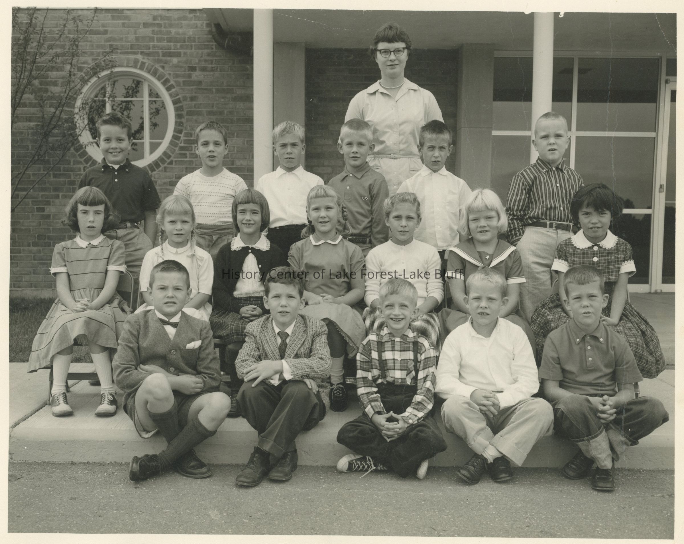 Unlabeled, but mostly likely taken at the front entrance of Everett School. Back of the photo has a stamp which reads: