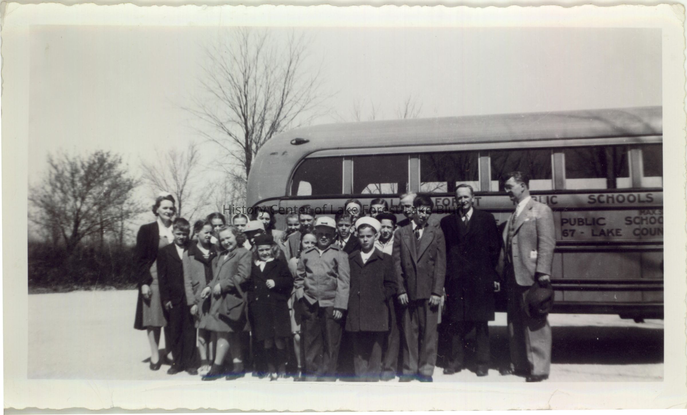 Group from Everett School on field trip to Springfield, 1940s. Field trip group posing in front of the school bus that says "Lake Forest Public Schools."