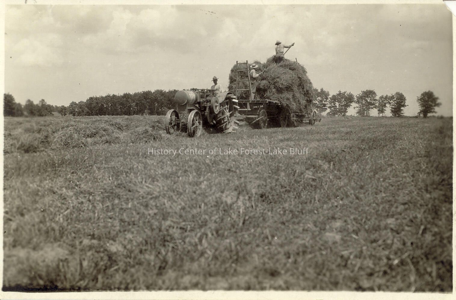 Everett Stock Farm haying. Tractor pulling a full cart of hay.