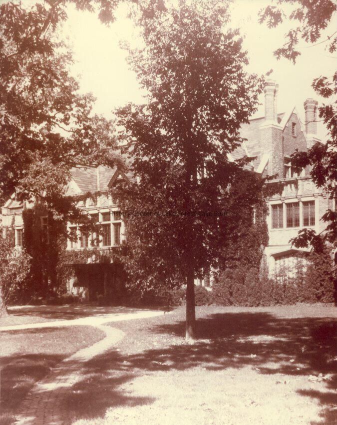 Three-story brick and stone residence with dormers and two chimneys at end White Oaks 425 North Sheridan Road Robert J. Thorne and Katherine Sterritt Thorne architect : Max Dunning, built before 1917 Gate house extant torn down c. 1940