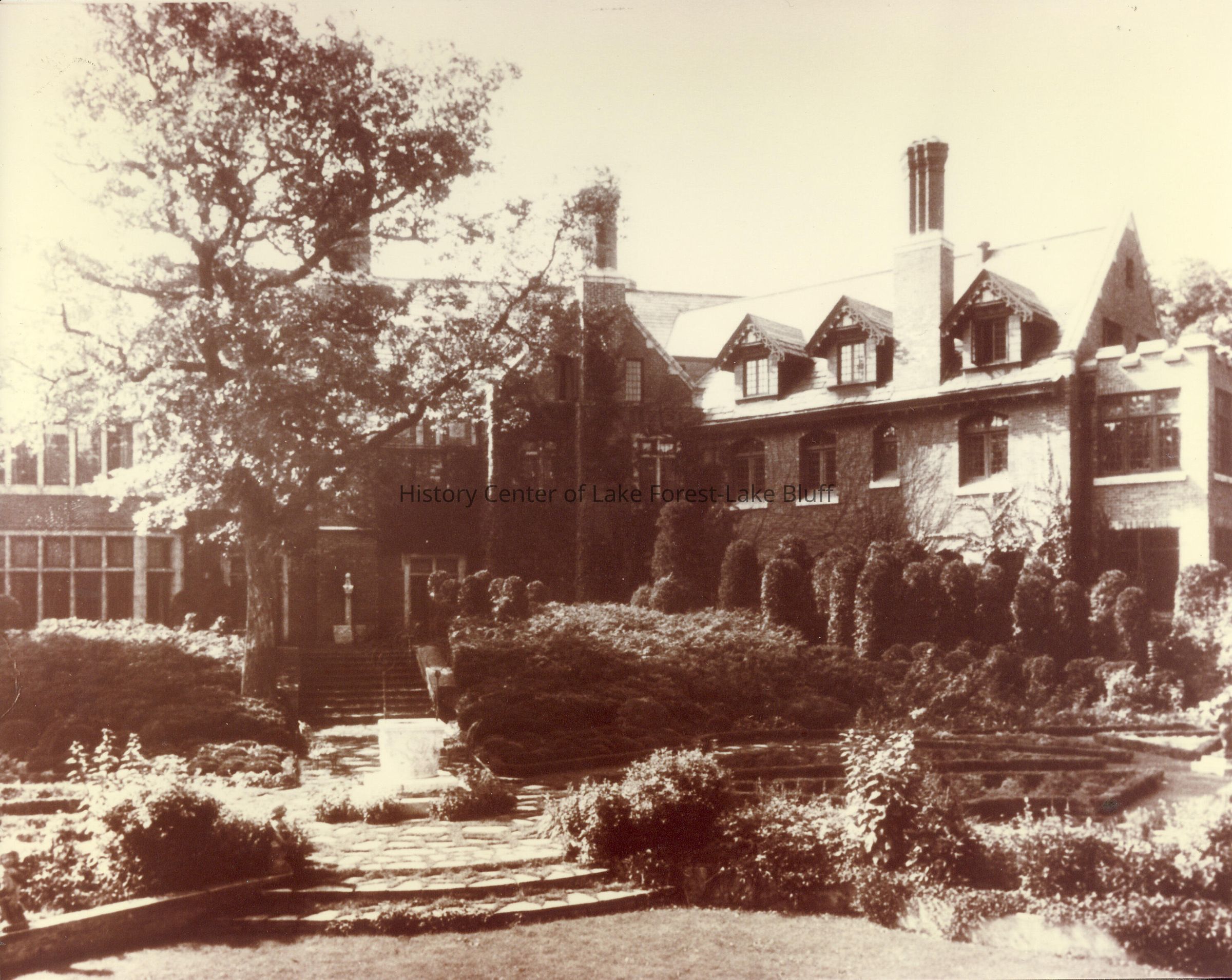 Exterior rear view of White Oaks showing three dormers and three chimneys with stone walkway and shrubs in foreground, with garden terrace