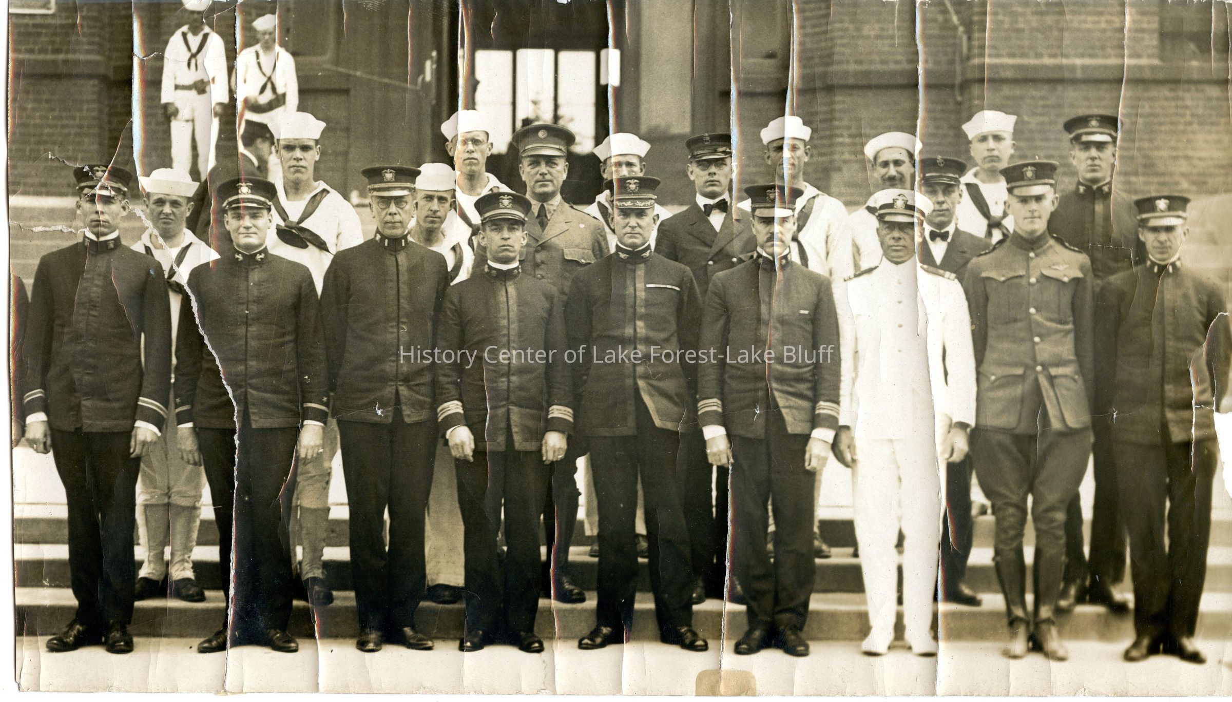 Photograph of unidentified Navy servicemen during World War I. Some identification on reverse: W. E. Clow, ? Reed, A. B. Dick Jr., William Dewey, William Moffett.