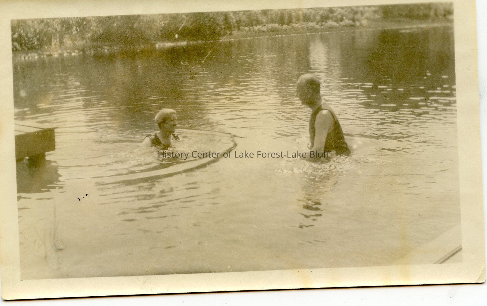 A picture of Robert McGann and Harriet "Baba" Smart swimming in a pond.