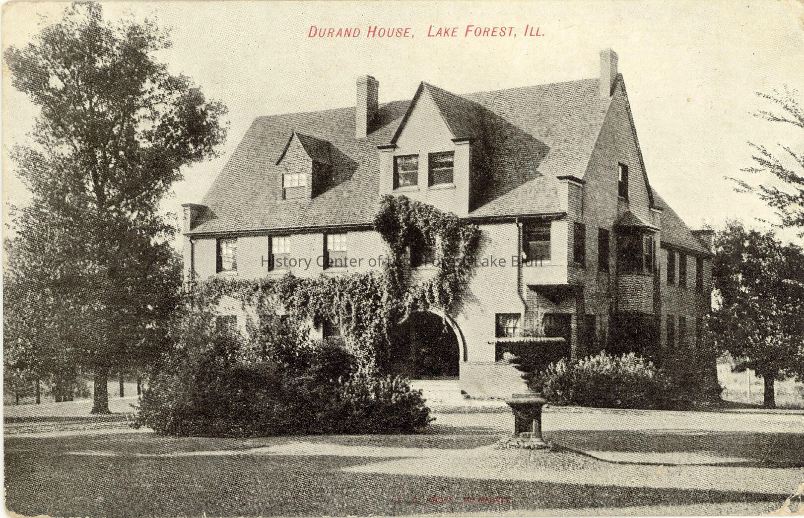 Postcard photograph of Durand House in Lake Forest, Illinois.Three-story house has gabled roof and dormers, arched entry, and fountain in front. On the reverse, no message written, only addressed to Miss Nellie Barrie, 168-45th Street, Chicago, postmarke 1907Lexicon