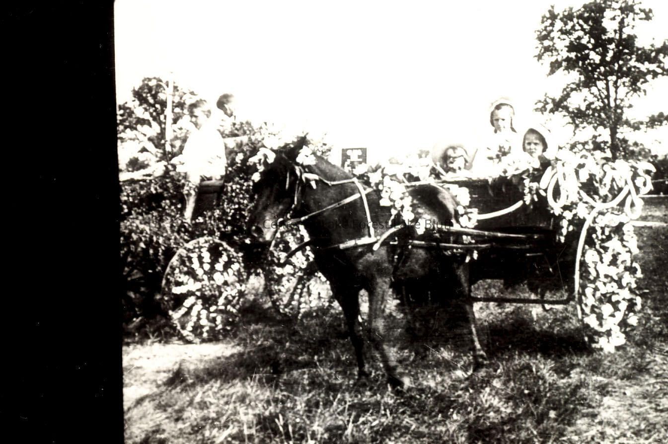 Black and white toned photograph of the Lake Forest Horse Show. Children seated in an elaborate carts decorated with garlands and flowers on the the wagon wheels.