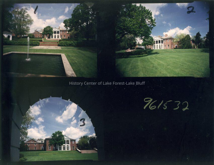 Contact sheet with three color images of Fairlawn exterior rear elevation, during period owned by the Papas family.