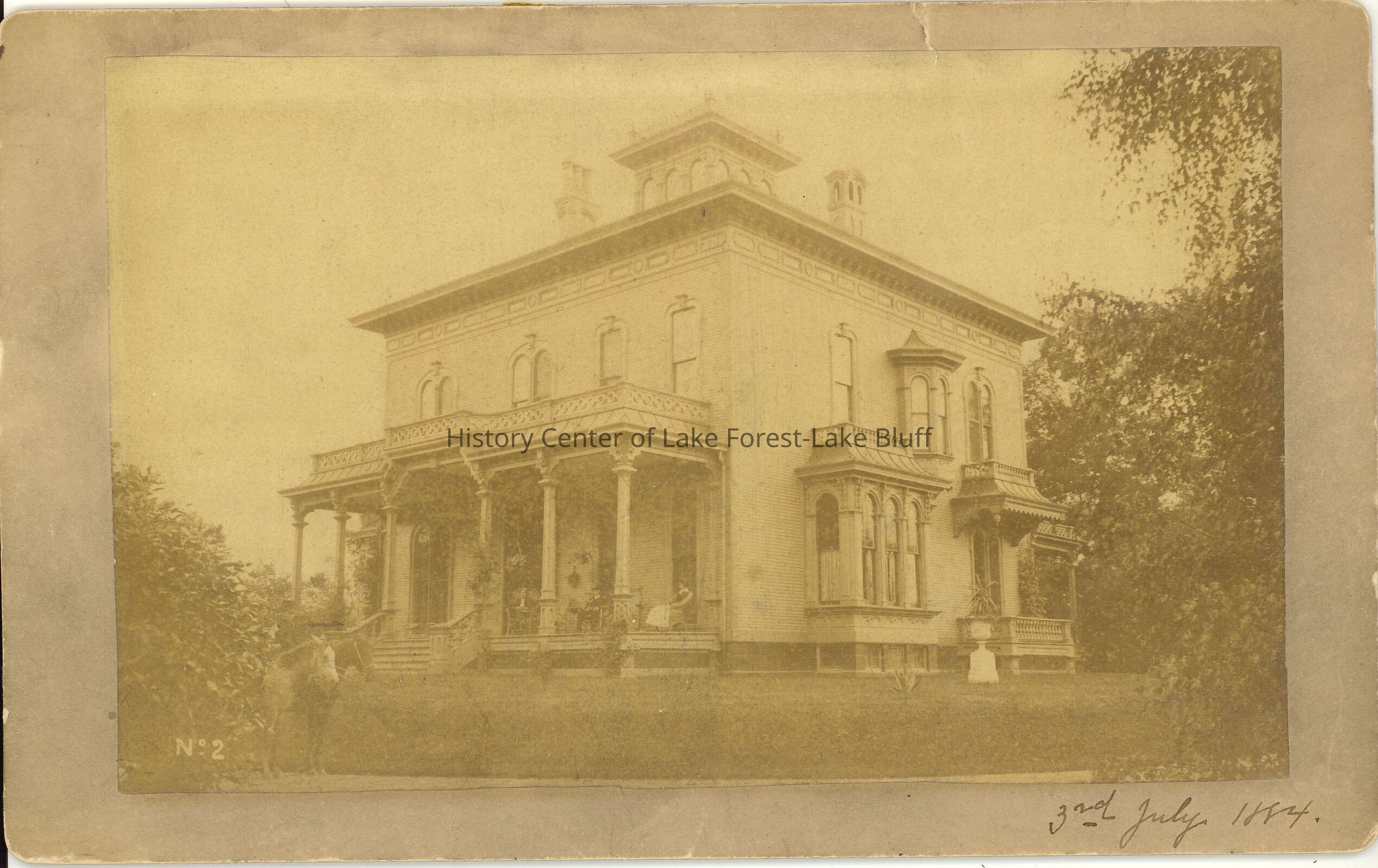Cabinet card with image of Fairlawn, the Charles B. Farwell home on Deerpath. Three unidentified figures are seated on the front porch. Two horses are visible with a carriage possibly behind a bush. Card is dated 3rd July 1884 in the corner.