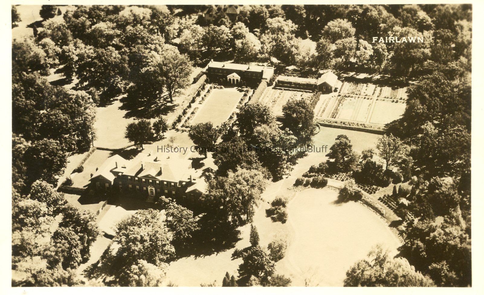 The aerial photo showcases the Fairlawn estate surrounded by lush gardens and trees.