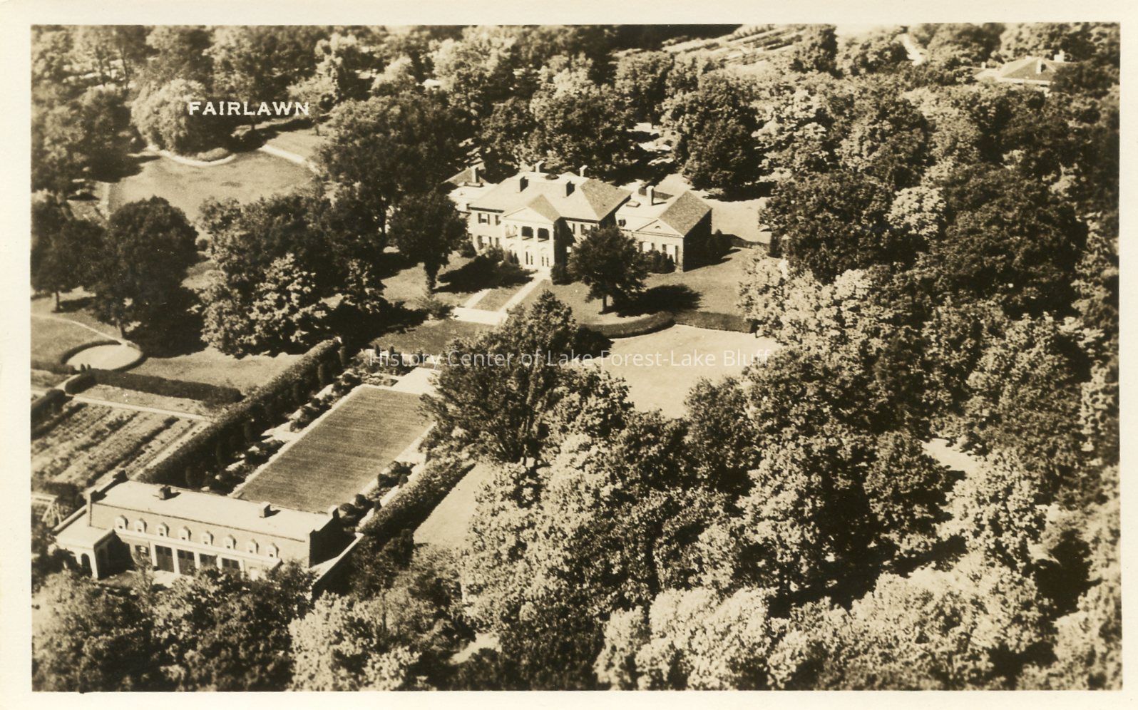 The image shows an aerial view of Fairlawn, featuring a large estate surrounded by lush gardens and greenery.