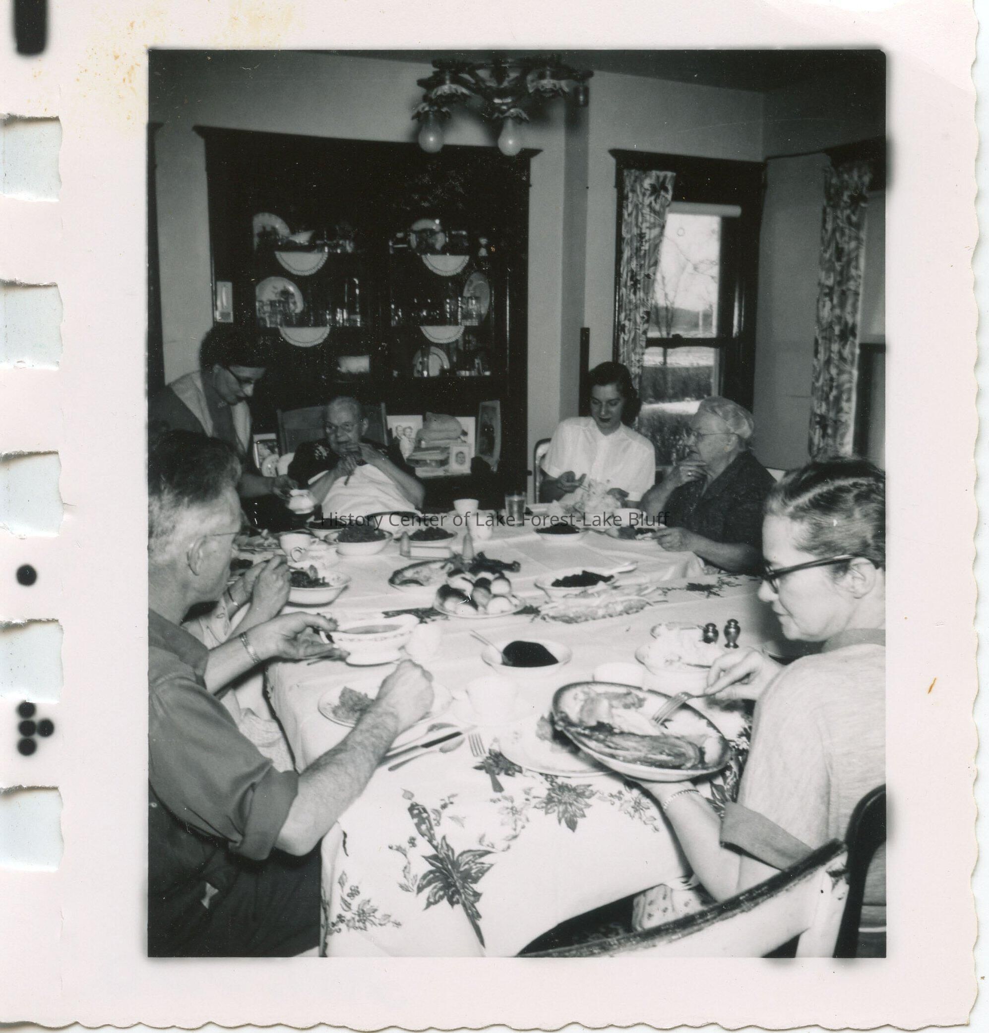Interior view of dining room. May be 1227 Waukegan Road, home of Mathilda Zieman Greene. Multi-generational gathering for dinner. Black and white photo.