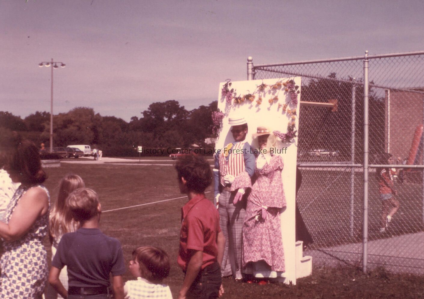 What looks like a school carnival--Huck Finn era photo op where people climb steps behind the exhibit and put their faces in the hole that is cut out for Huck and Becky's face. Photographs relating to Lake Forest Hospital collected for the 100th Anniversary of the Hospital by the Development Department.