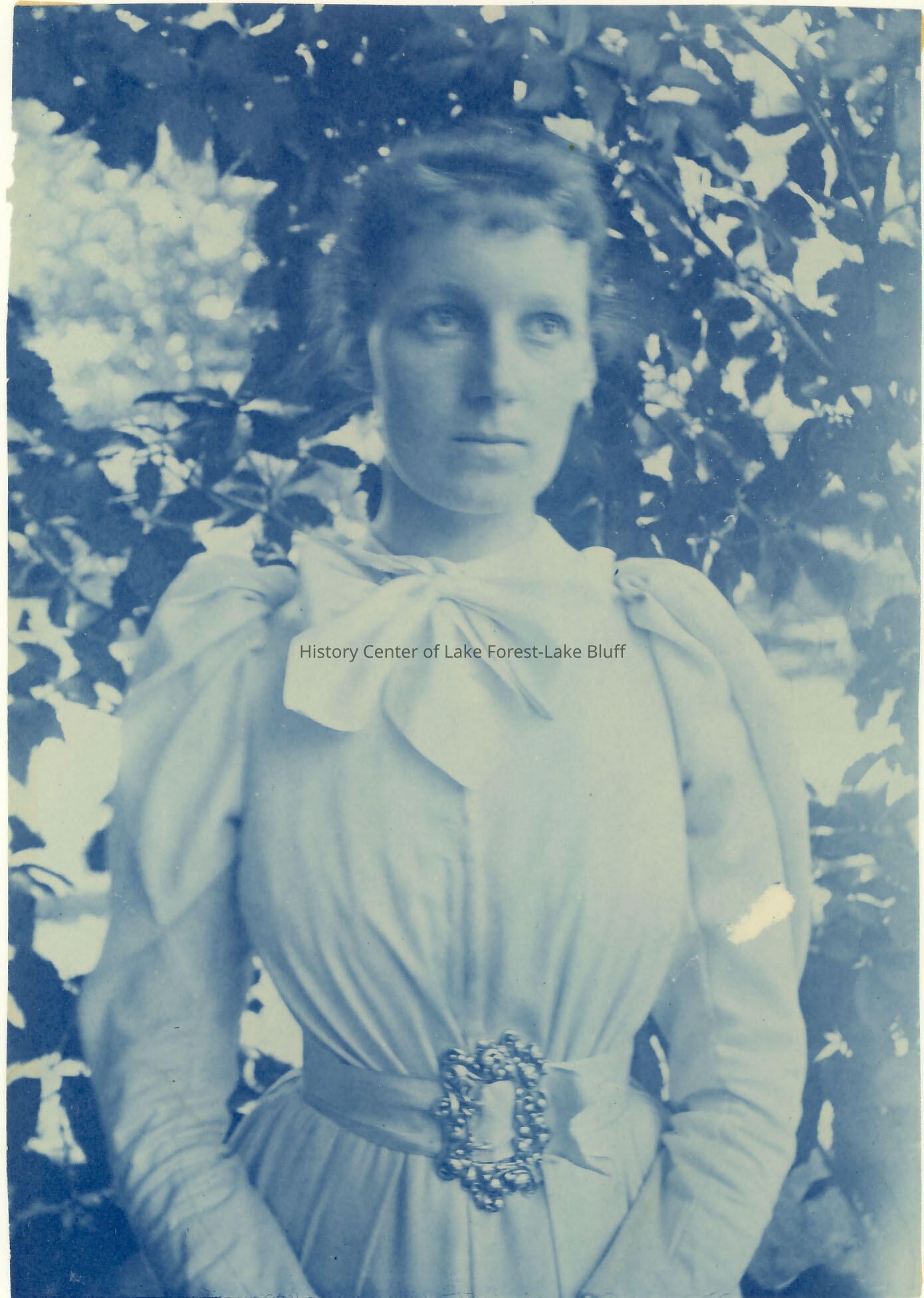 Farwell Family - mostly 1880's Anna Farwell - close-up/outside, half-length portrait wearing a long-sleeved dress with a bow at the neck and decorative belt, printed on blue processing paper