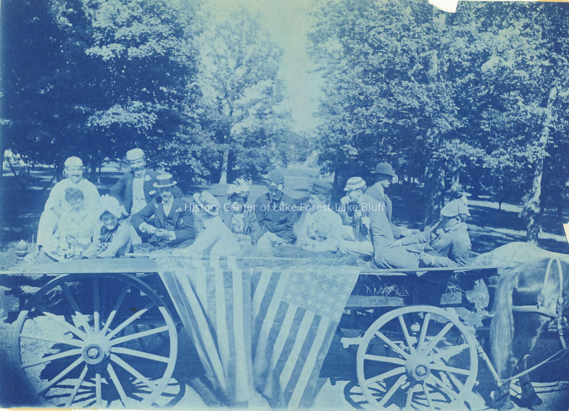 Farwell Family - mostly 1880's July 4th 1885 hayride with Senator Farwell's family. There is an American flag draped on the wagon, and several men and women sitting and lying on the wagon. Photographs are printed on blue processing paper.