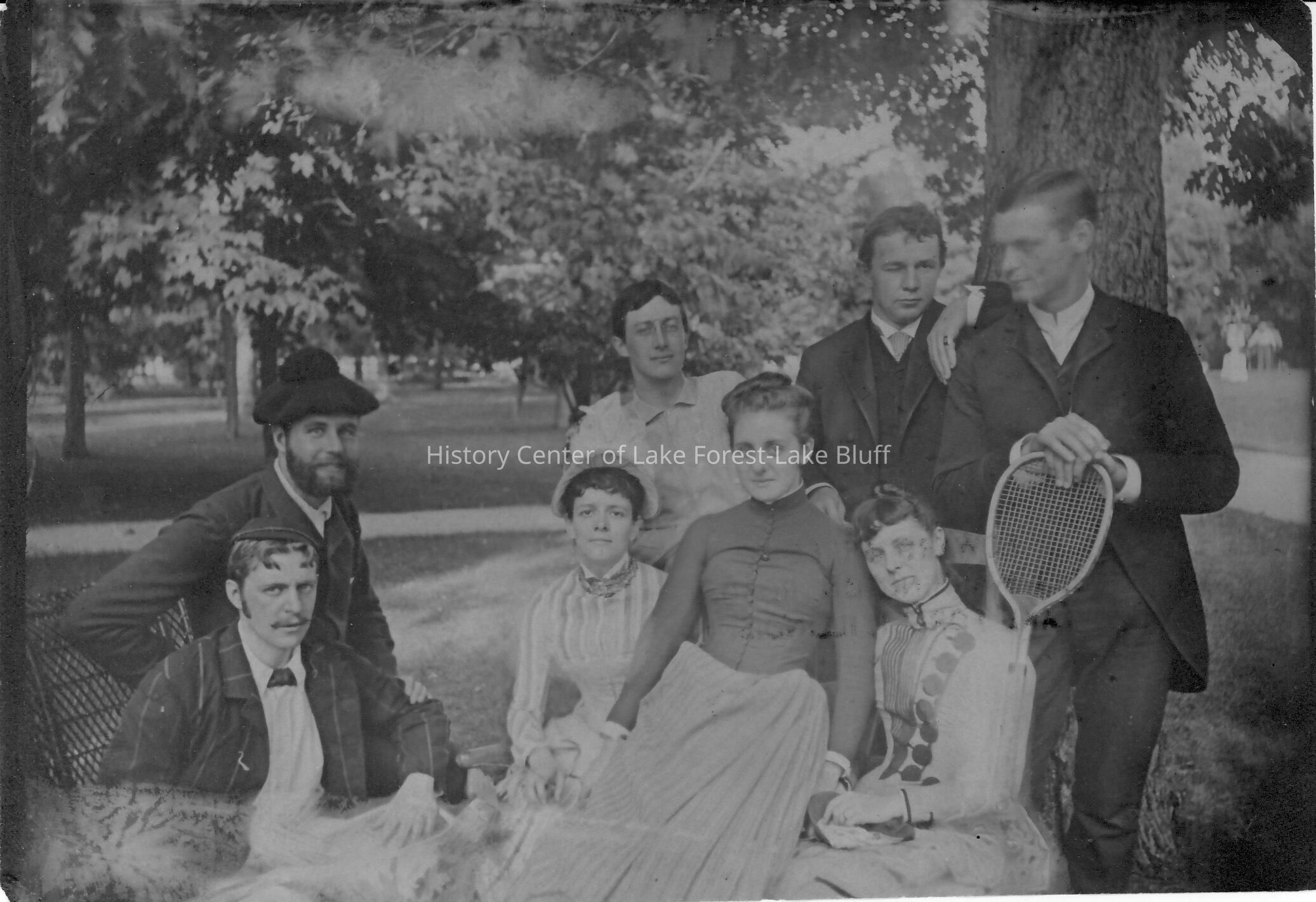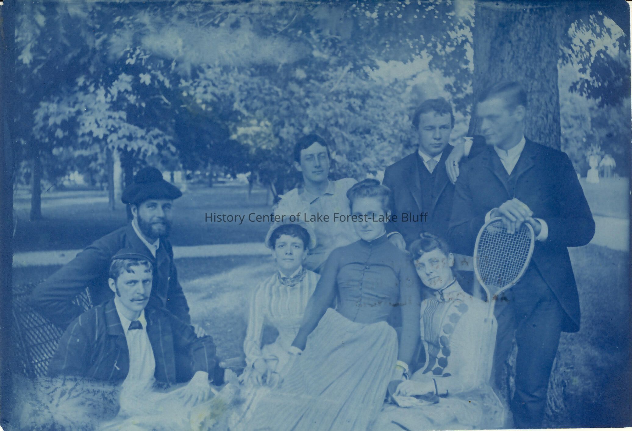 Mrs. Charles B. Farwell (Senator) and family. c. 1885. Eight people are depicted outdoors, with one male holding a tennis racket. Photograph is a blue publishing proof. Anna Farwell and Grace Farwell are flanking their mother. Reginald DeKoven is seated at bottom left. Walter Farwell may be standing at right.