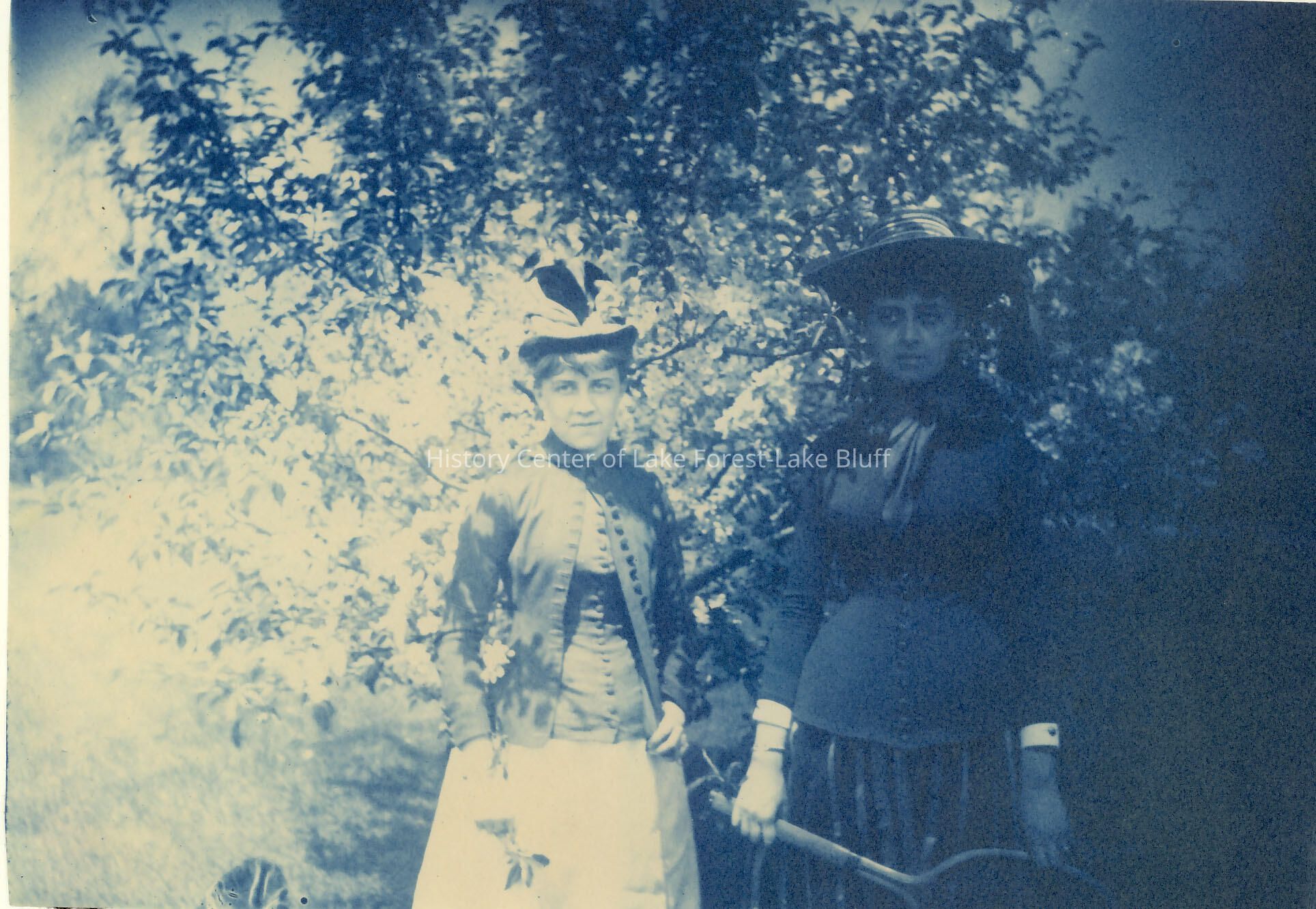 Farwell Family - mostly 1880's picture of 2 women taken by Grace Farwell, one holding tennis racket, printed on blue processing paper