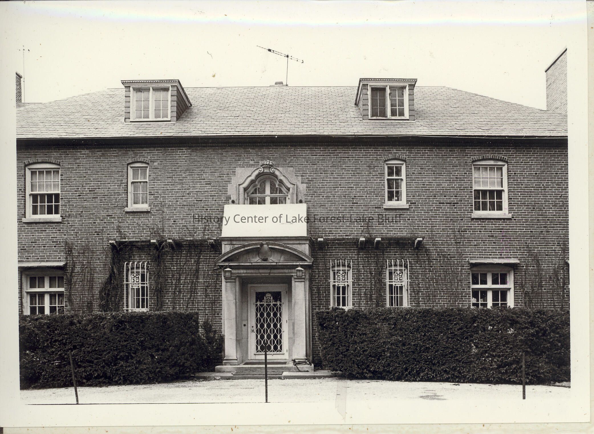 Two story brick residence with slate hipped roof with flat-roofed dormers. Above center entrance is a window beneath a stone basket of flowers. Entrance door and three first-story windows are covered with grills. Photo is dated March 7, 1981