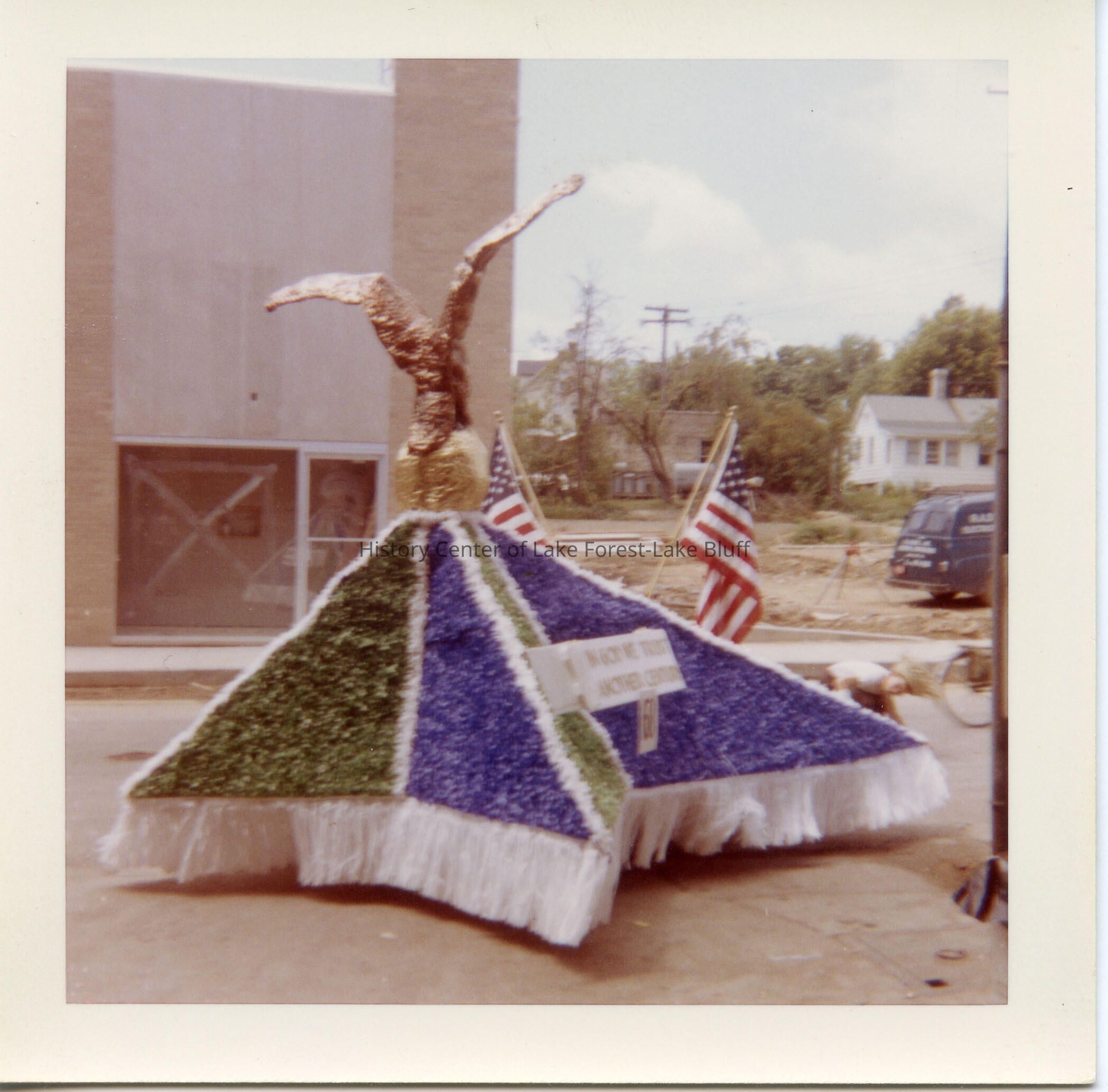 Kodacolor print dated August 1961. Blue and green star-shaped parade float topped by gold eagle and American flags. Banner reads "In God We Trust. Another Century." Probably for Lake Forest Day parade. Entry number 68.