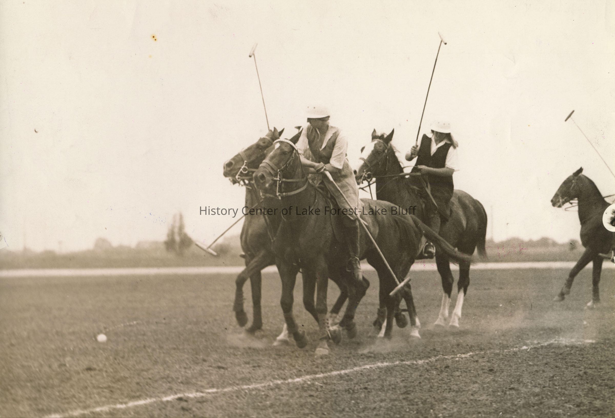 Three female players vie for the ball in the center of the field. Two players have mallets raised. Onwentsia Polo Team