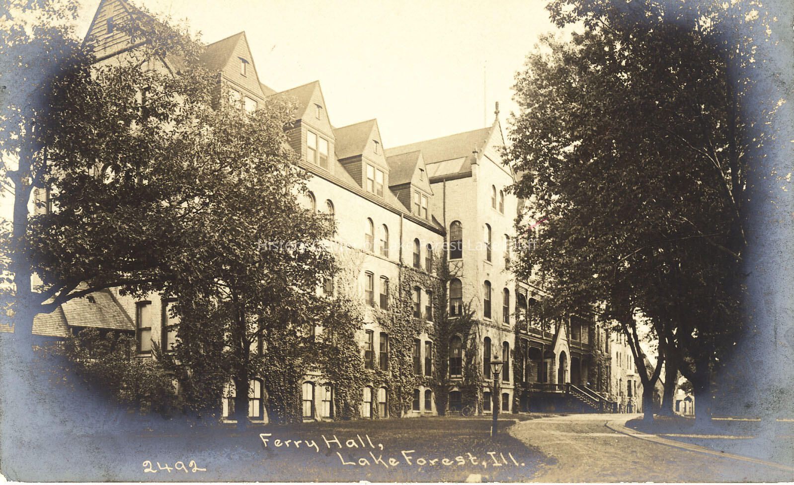 Five-story masonry structure with peaked roof, dormers, and pairs of rounded windows on each floor. Ferry Hall Chapel built 1869 by architect O.L. Wheelock. William Montague Ferry: founder. reverse of postcard is blank