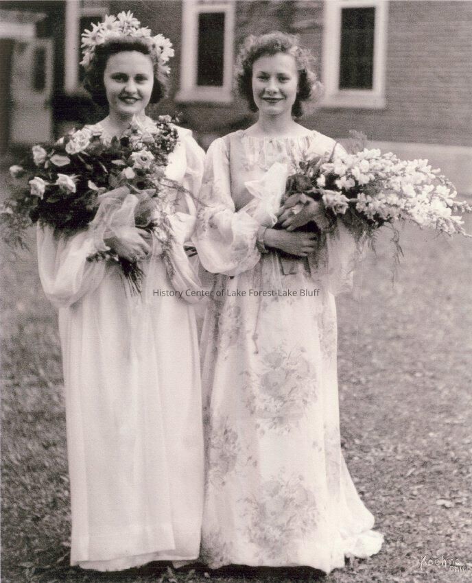 May Day. Two young women dressed in long dresses with flowers in arms. Woman on left is wearing flowers in her hair, while the one on the right in searing a floral print dress. Black and White image.