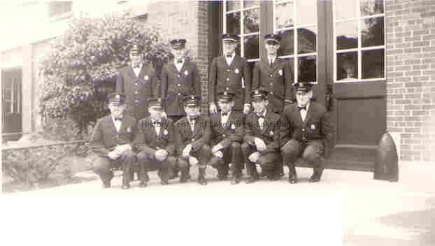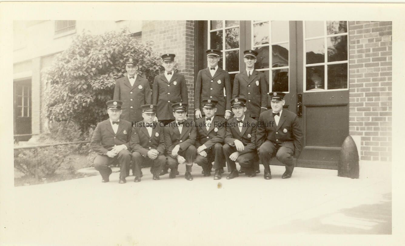 Fire Department group picture. 10 unidentified men posing in front of building. Forest Avenue Fire Station