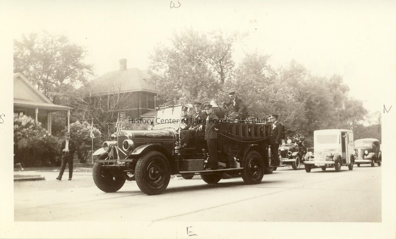 Lake Forest Fire Department. Firemen posing on fire engine on Forest Avenue, 1939. Engine is decorated with flags and is in a line of vehicles that looks like a parade.