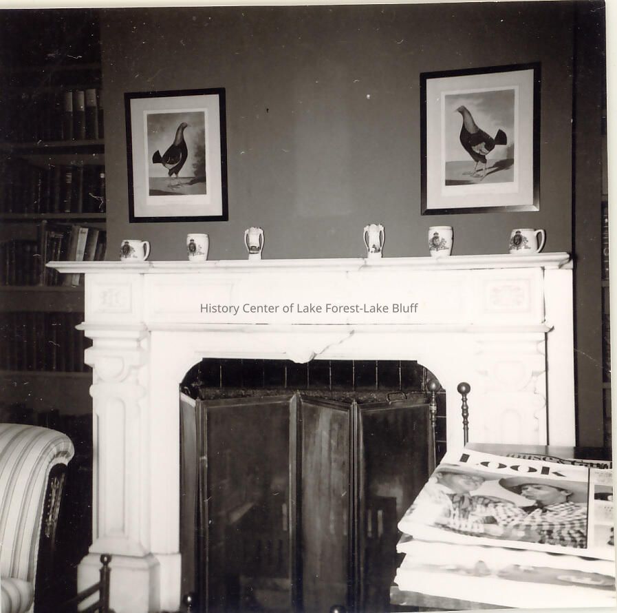 Interior of fireplace. 2 framed fowl prints above fireplace. collection of mugs on mantelpiece. partially-seen striped chair and built-in bookshelves.