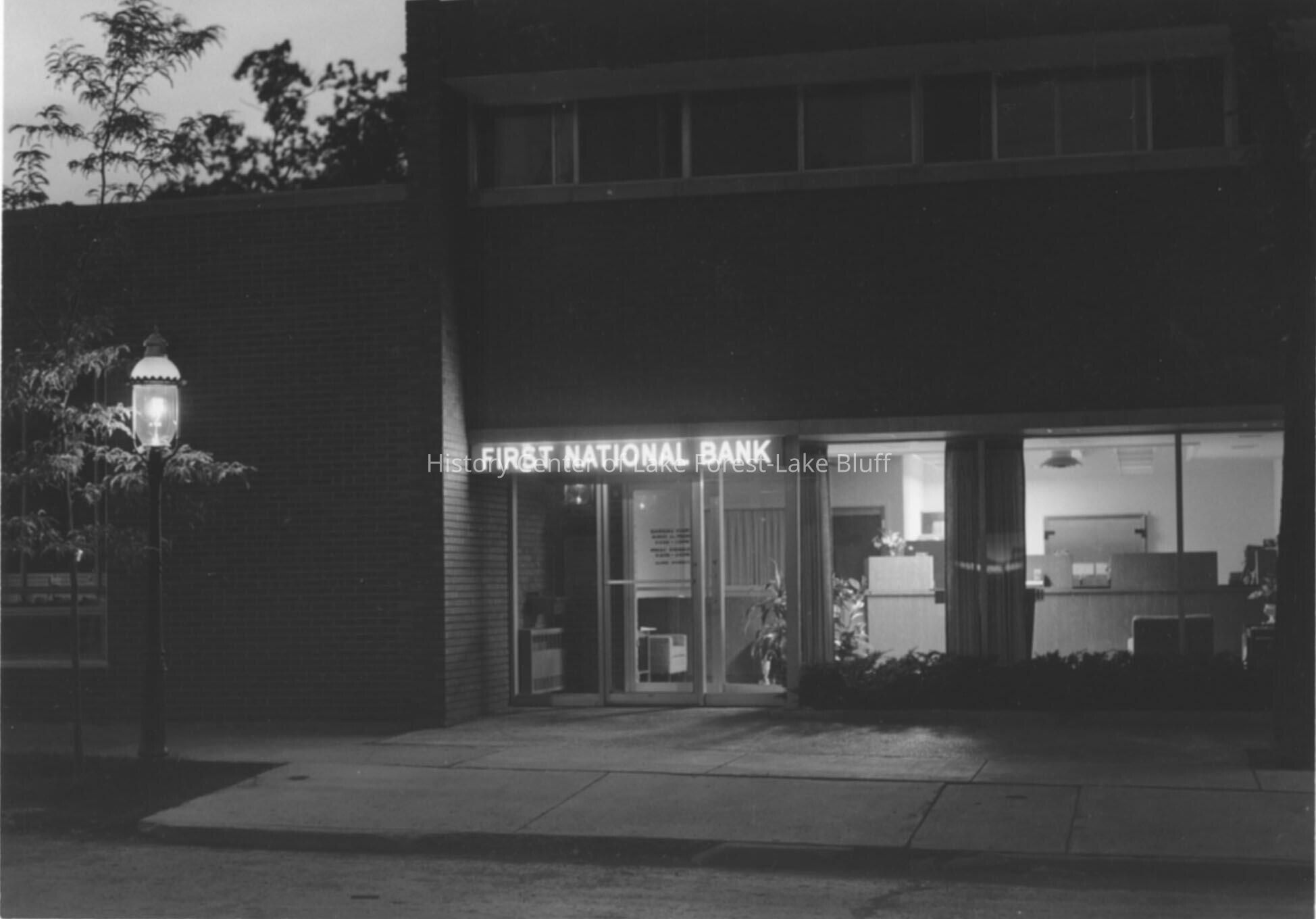 Lake Bluff Business First National Bank (30 East Scranton Avenue). Night view with street lights. Verso: July 8, 1965