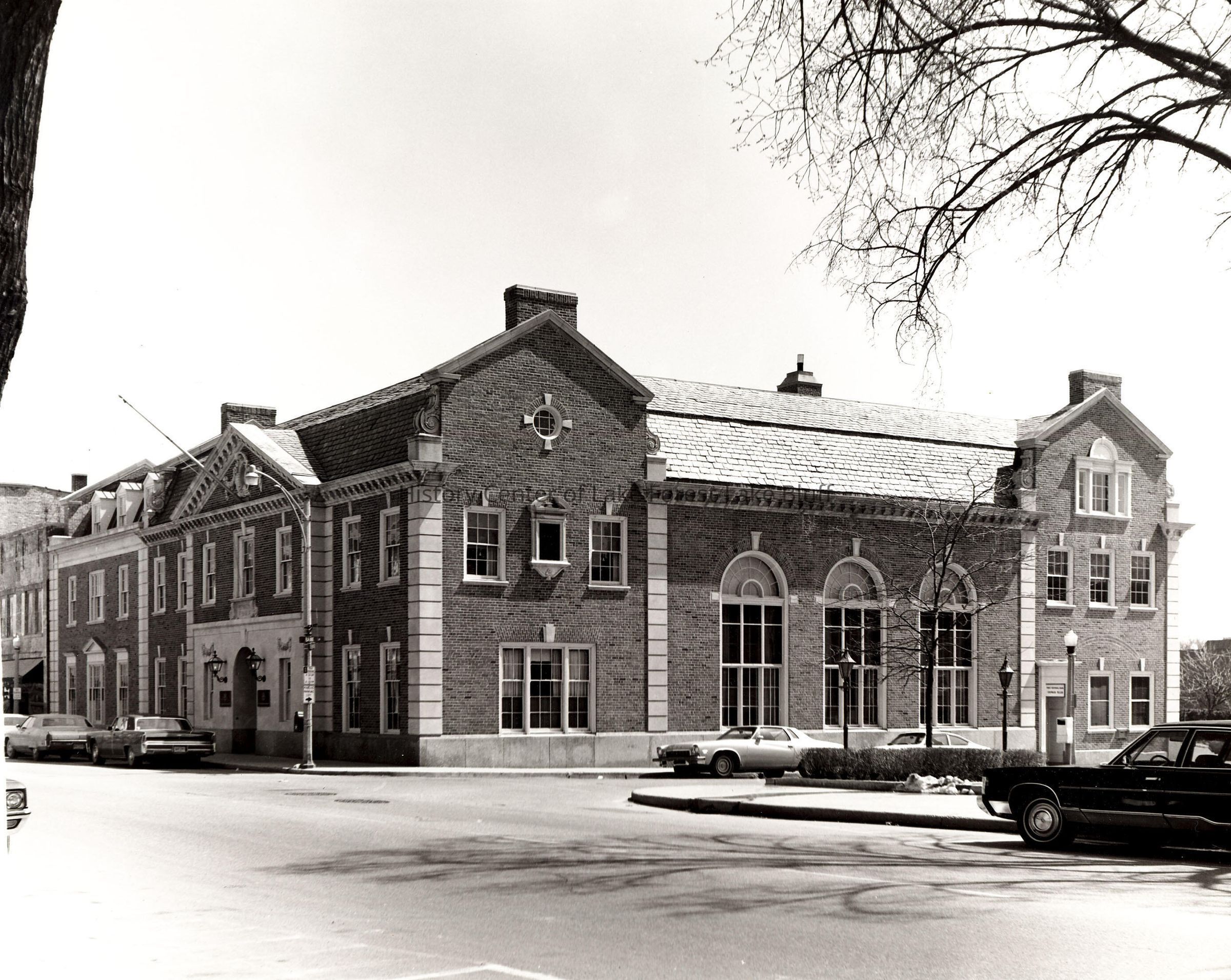 Black and white photograph of exterior First National Bank of Lake Forest from intersection of Deerpath and Bank Lane. 265 East Deerpath by architect Stanley Anderson in 1931.