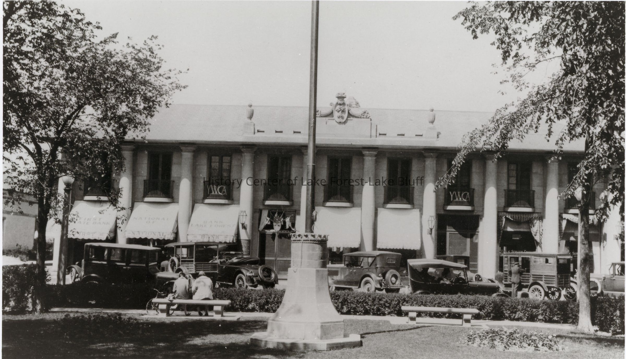 First National Bank of Lake Forest with YWCA banners on second floor. Flag pole in middle of green space of Market Square. a reprint is also included. was Marshall Field's negative included
