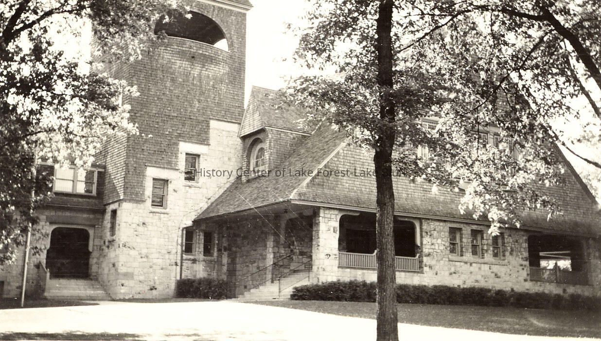 Black and white photograph of the exterior of First Presbyterian Church of Lake Forest. Verso: "Church before 1961"