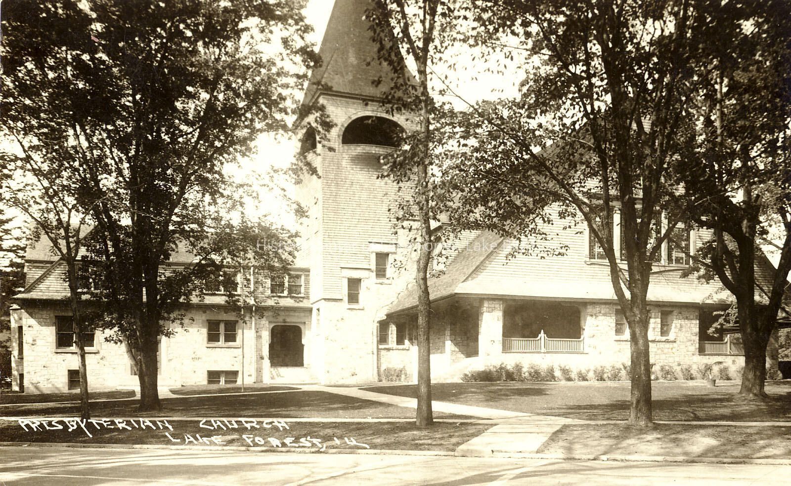 Black and white slightly sepia toned horizontal postcard of the exterior of First Presbyterian Church of Lake Forest. Postmarked Dec. 27th, 1926.