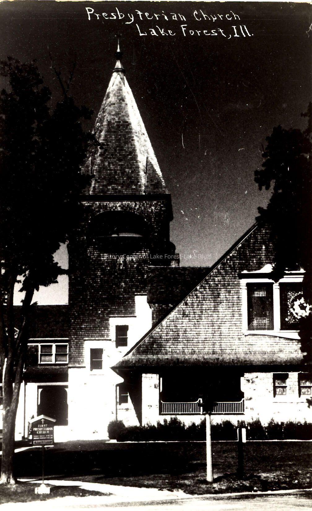 Very dark black and white vertical postcard of the exterior of First Presbyterian Church of Lake Forest. Traffic light is visible.