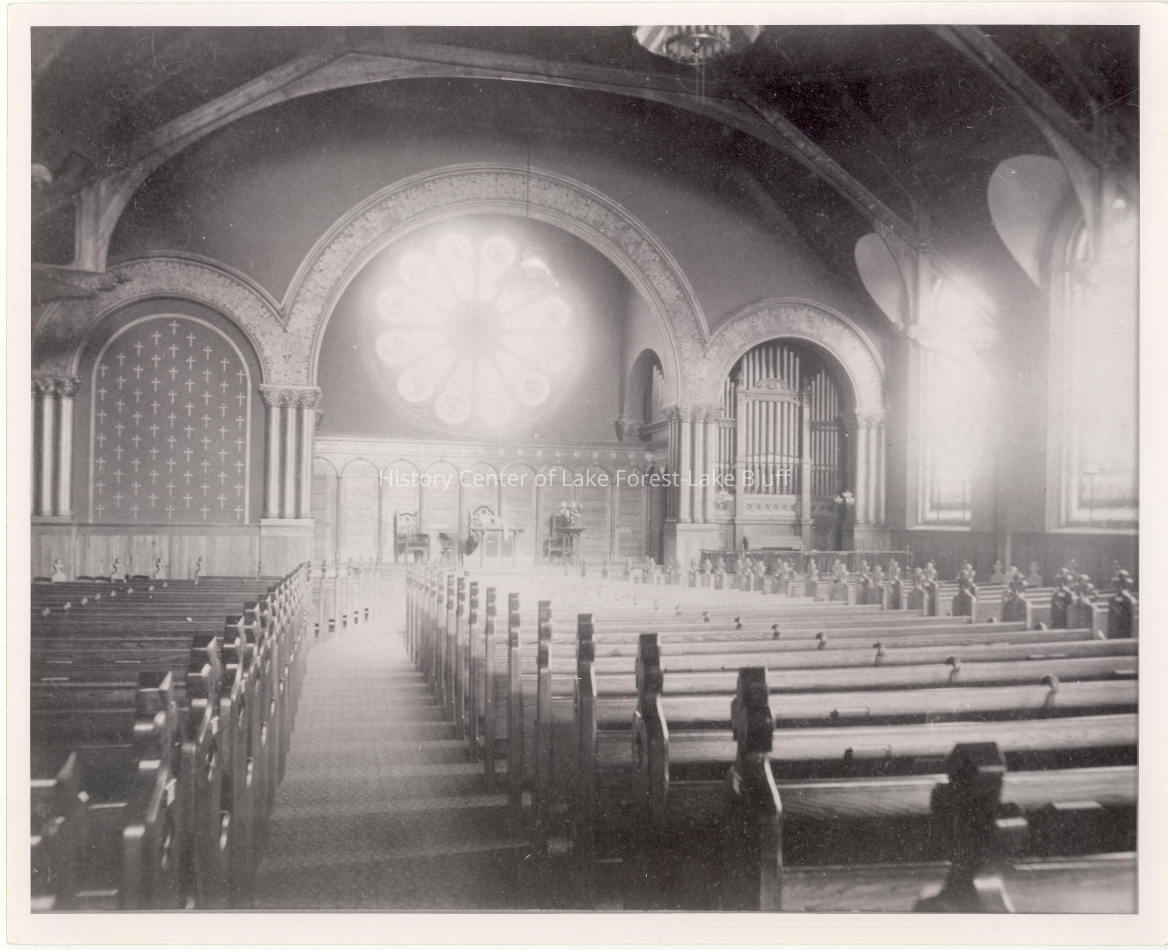 Black and white horizontal photograph of the interior of the First Presbyterian Church of Lake Forest. The "Rose Window" of gleaming blue glass was removed during the Louis C Tiffany redecoration of the church in 1902