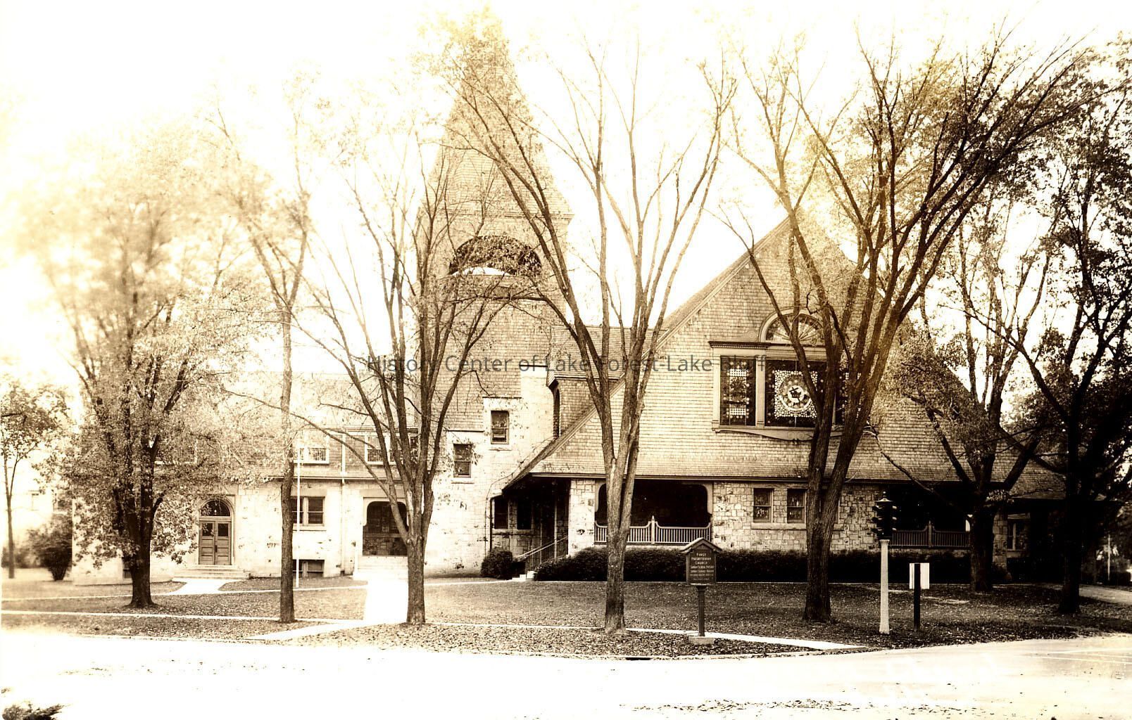 Sepia toned horizontal postcard of the exterior of First Presbyterian Church of Lake Forest. Includes the traffic light at the corner.