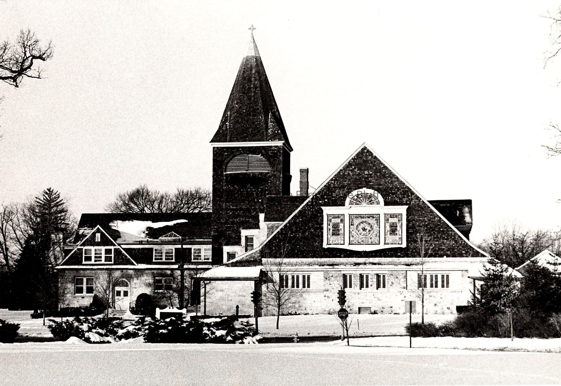Black and white vertical image of the exterior of First Presbyterian Church of Lake Forest., snow on the ground and traffic light is visible.