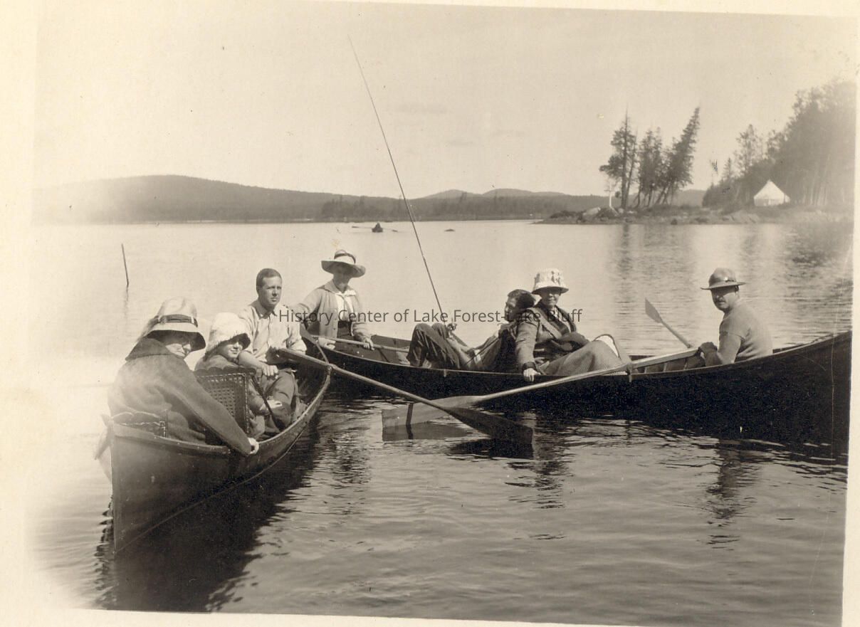 Three row boats with unidentified men and women fishing. At Durand Camp, Long Lake, Adirondack Mountains, New York.